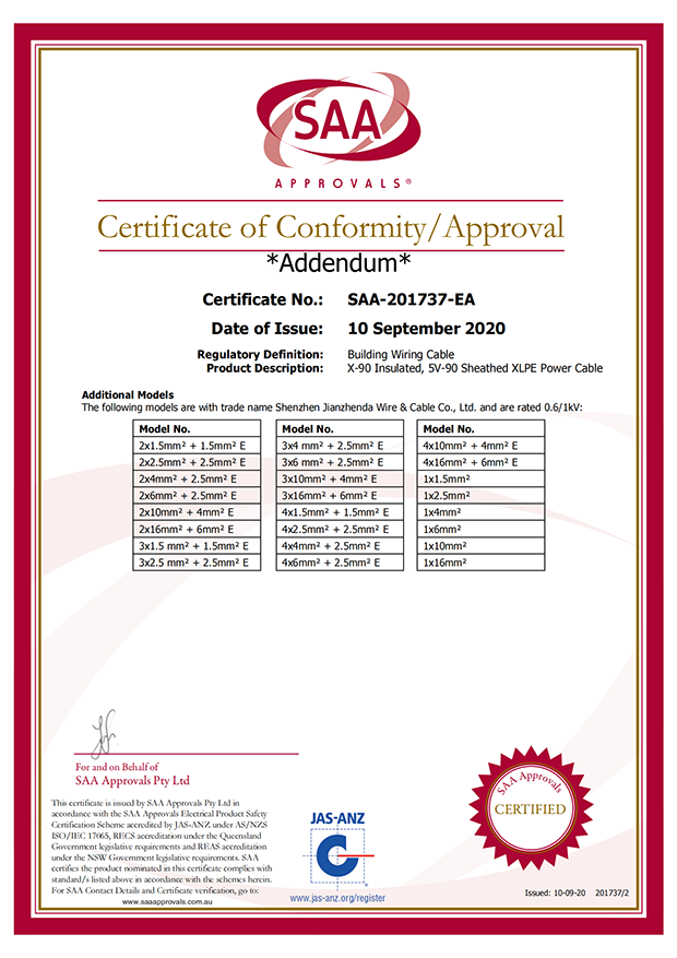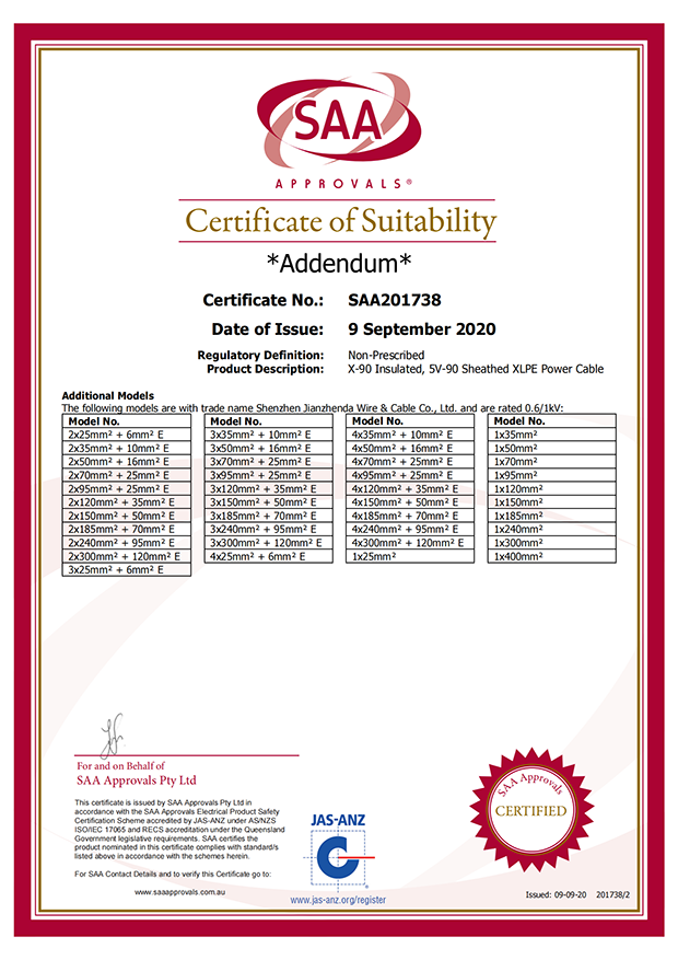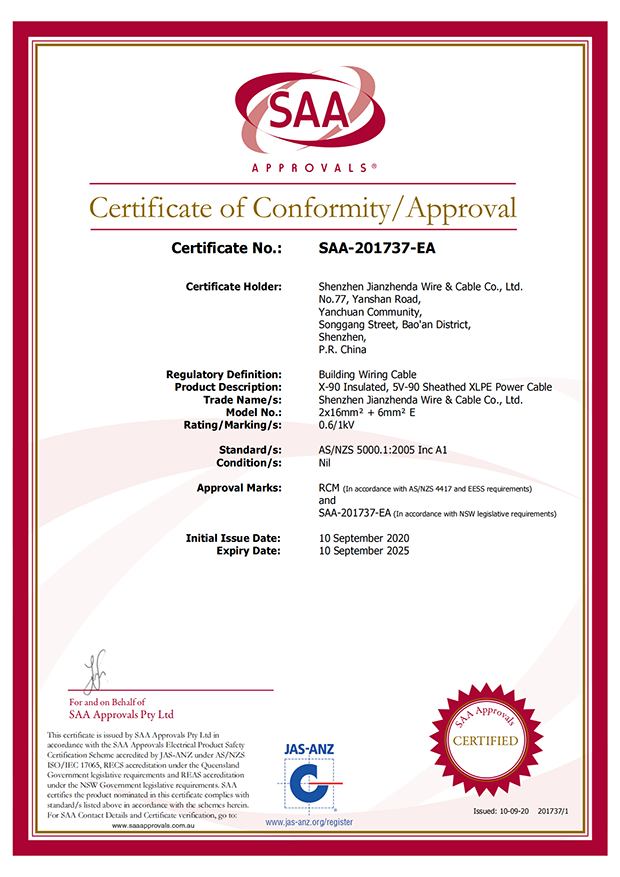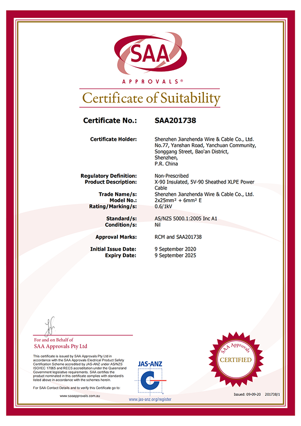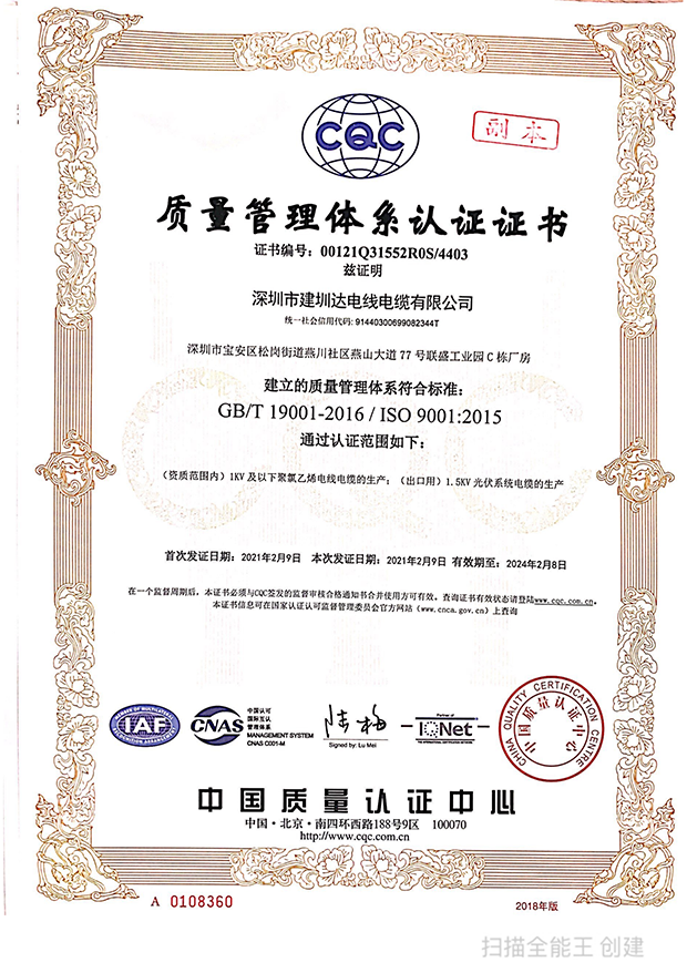 深圳建圳達(dá)電線電纜有限公司,成立于2000年,是一家電線電纜制造商,我們通過了世界各地不同市場(chǎng)的多數(shù)認(rèn)證,如:CCC、RoHS、CB、SAA、TUV、VDE、PSE、BPS、UL、CSA。我們根據(jù)定制產(chǎn)品不斷更新新的認(rèn)證。經(jīng)過數(shù)十年的發(fā)展,我們與來自世界各地的客戶建立了長期的合作關(guān)系。我們?cè)?jīng)是菲律賓機(jī)場(chǎng),,柬埔寨的電力站,美國的醫(yī)院,工廠,埃塞俄比亞的水電站項(xiàng)目。我們是一家值得信賴的電線供應(yīng)商。